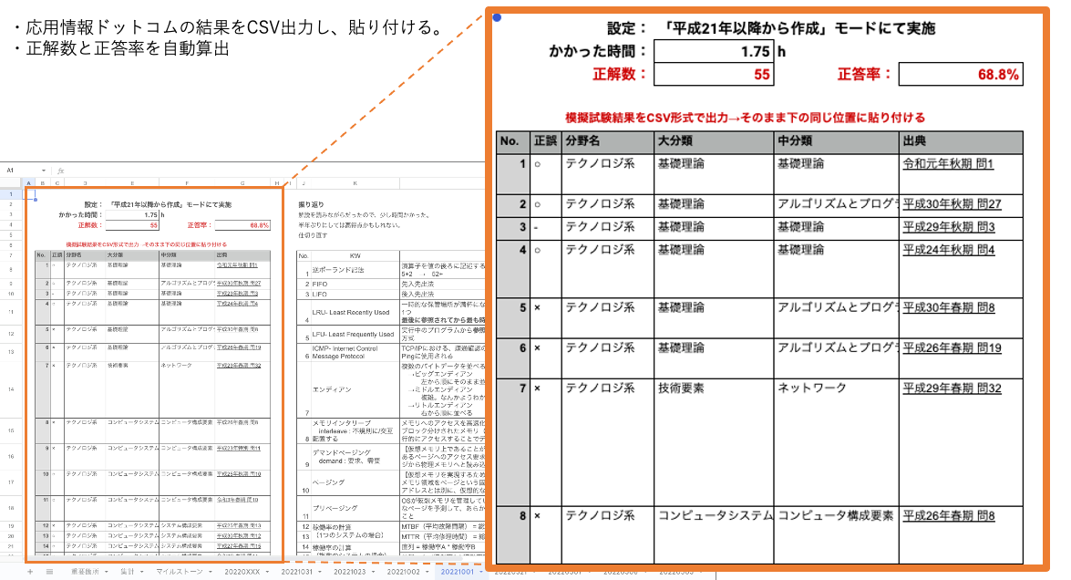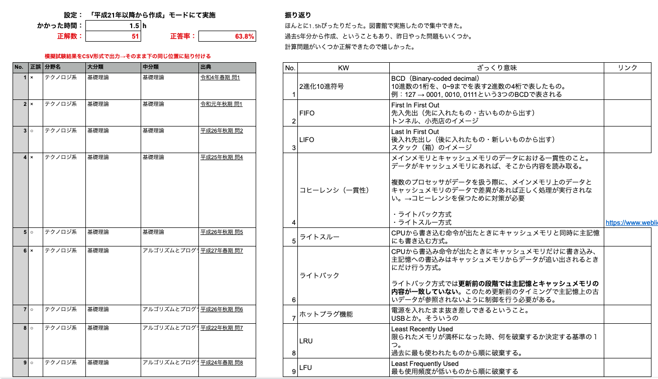 ということで、スプレッドシートを使って、午前問題・午後問題をそれぞれ管理するシートを作成し管理しました。