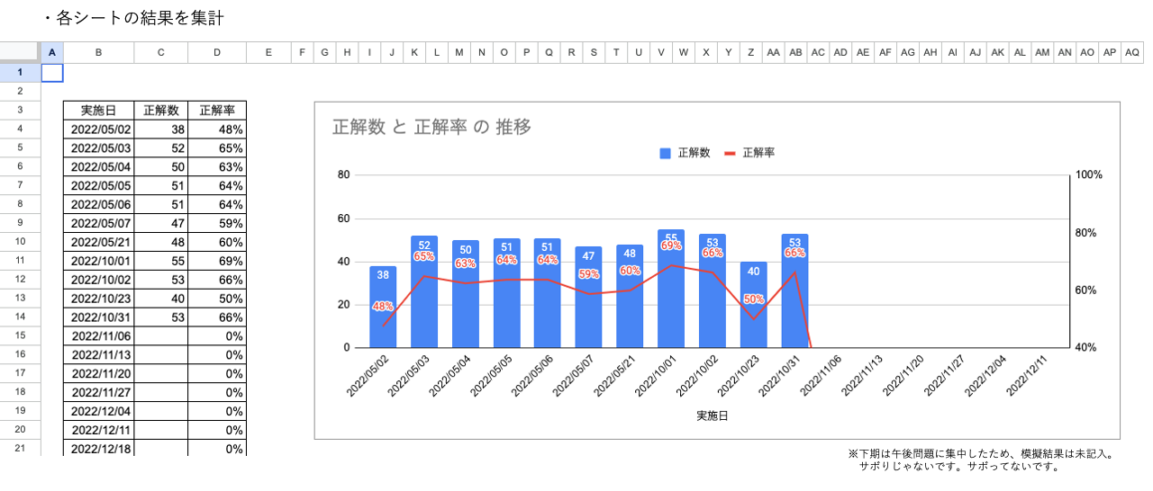 そしてその内容をコピペすると「正解数」と「正答率」が自動算出されるシートを作成しました。