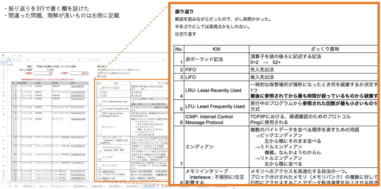 辞書のように『用語ー意味』の紐付けが一目でわかる状態にしておくことで、振り返りがしやすくなります。