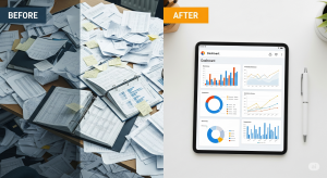 絡まったExcelシートと整理されたダッシュボードの対比